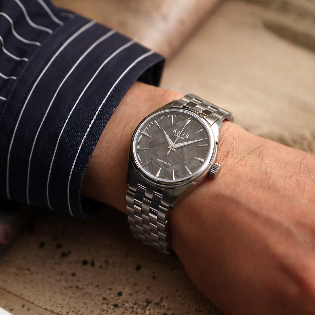 KNIS Meteorite Dial Watch宇宙から飛来したメテオライト(隕石)を文字盤に用いた日本製腕時計。メテオライトの特徴である美しい神秘的な網目状の模様( ウィドマンシュテッテン構造)は特殊な状況下(宇宙)において、約100万年以上を要するため、地球上では再現できないと化学的に解明されています。神秘的な模様を浮かび上がらせるメテオライトは、100万年の時が刻まれた美を放ちます。その美しさは、まるで小宇宙が手元にあるかのような魅力溢れる至高の一品です。