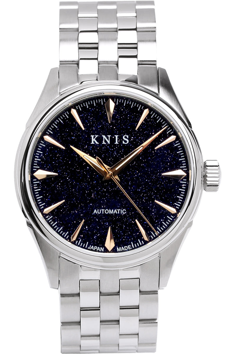 KNIS Aventurine Dial Watch星空のような輝きのアベンチュリンガラスを文字盤に用いた日本製腕時計。アベンチュリンガラスは18世紀のベネチアに起源をもつとされる人造石の一種で、ガラス質の素材のなかに酸化銅の極小の結晶を内包することで、夜空に輝く星を思わせる神秘的な輝きを放つ。
