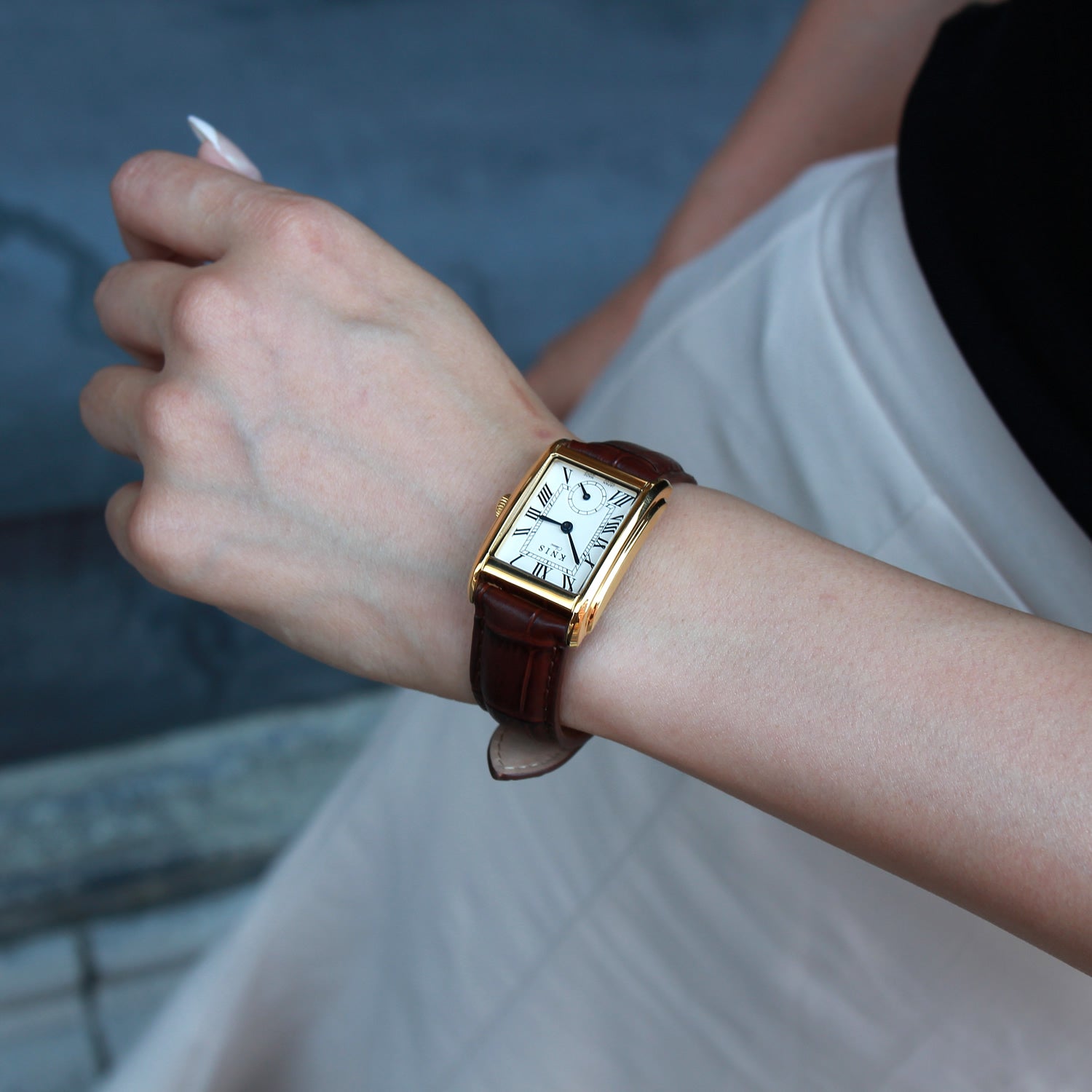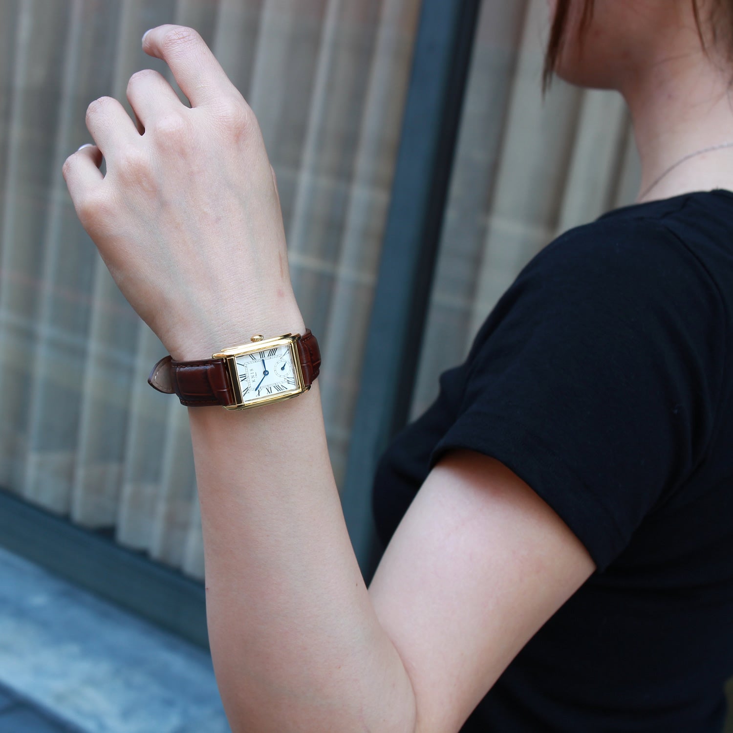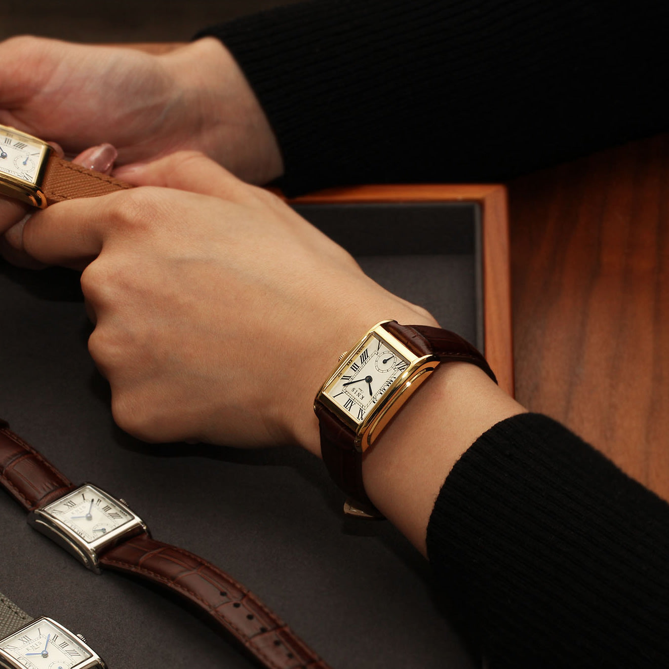 この時計は、細身の腕元にも美しく映えるクラシックなレクタンギュラー(長方形)型のドレスウォッチです。都会的で洗練された印象を持ち、レストランでの食事やカジュアルな遊びのシーンでも、上品な気配をそっと添えてくれるような存在を目指しました。