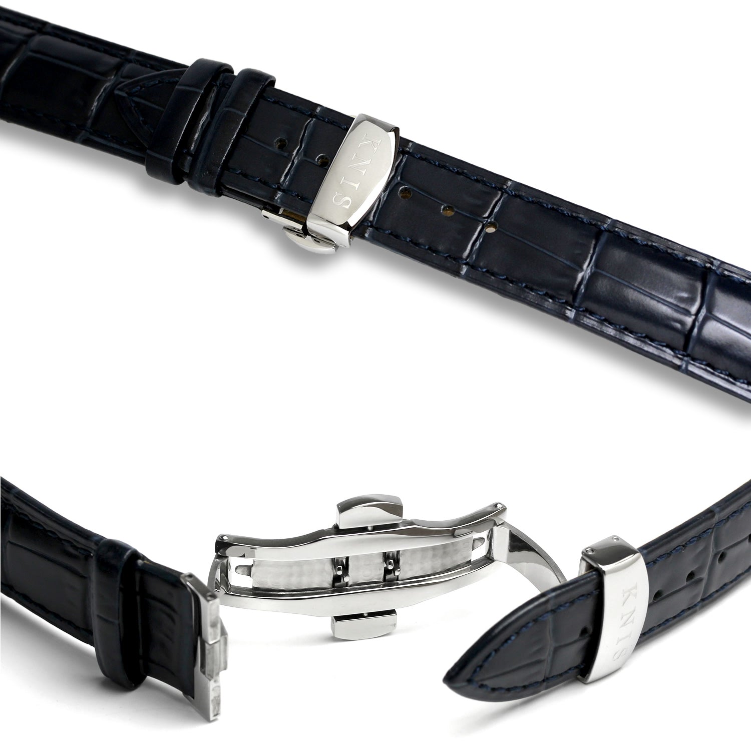 観音開きタイプのDバックルは、見た目が美しく高級感漂います。高級時計のレザーストラップに限って使われるDバックルを装備することにより、着脱のストラップへのダメージを最小限に抑えつつ、滑落を防ぐ事ができます。