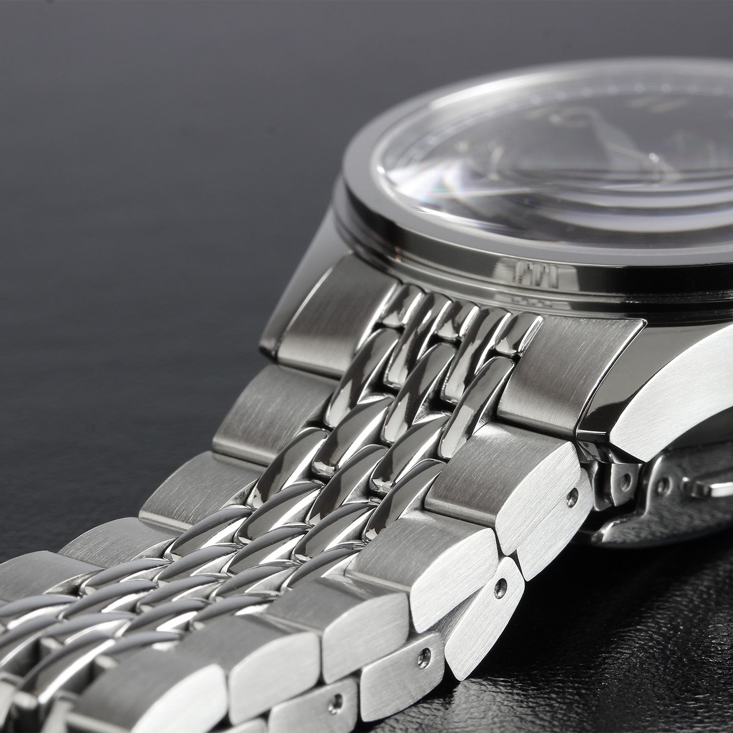 This watch is fitted with a rice bracelet that pairs beautifully with classic designs. Inspired by vintage watches from the 1940s to 1960s, its finely grained link structure offers a supple, comfortable fit and an elegant, understated sparkle.As the wrist moves, the small, rounded links catch the light, creating soft shadows and a subtle three-dimensional presence.